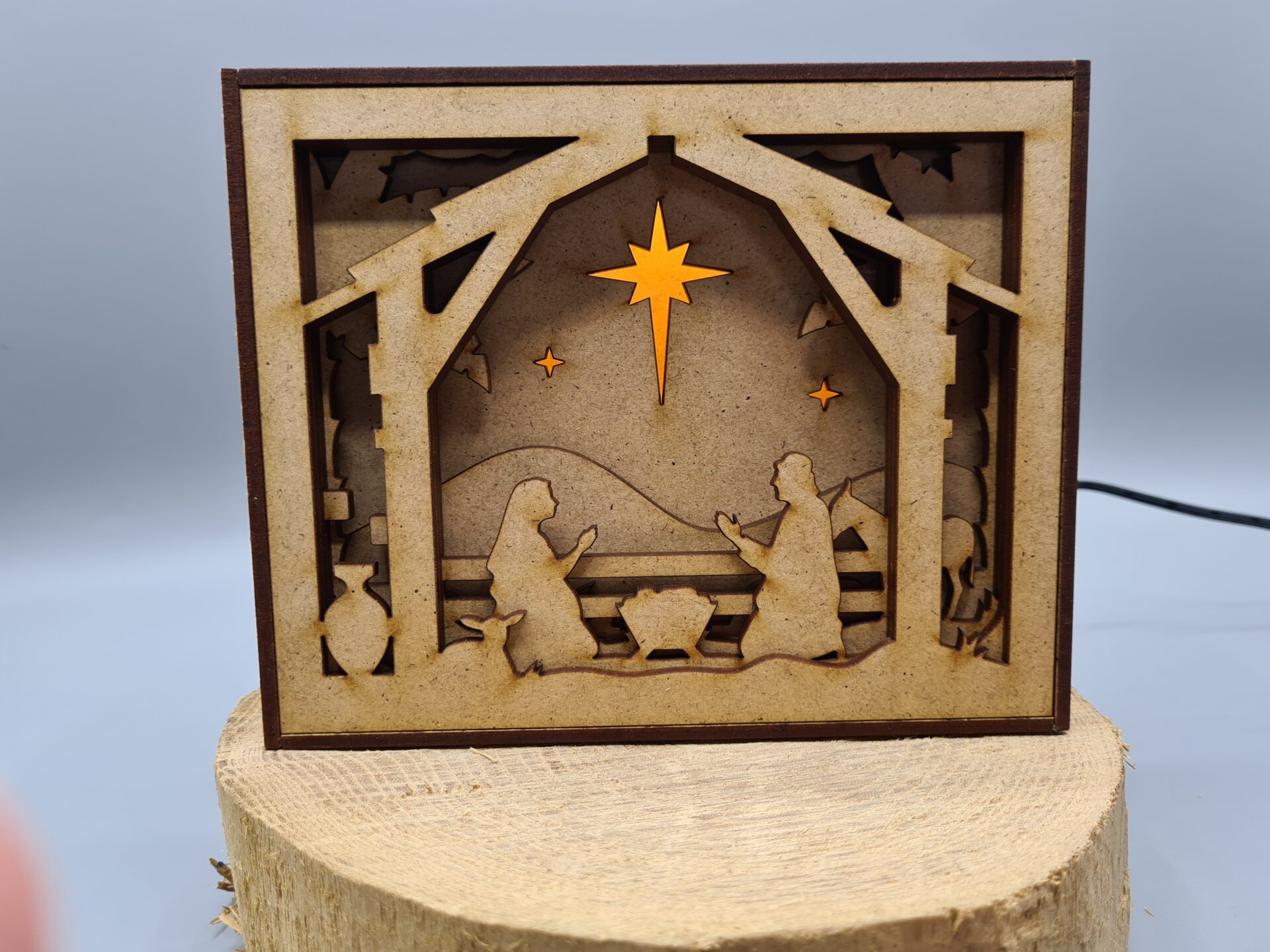 La boite permet de diffuser une lumière LED au travers du décor. Cela vous permettra d’avoir une lampe garnie d’un décor et d’avoir la possibilité de le changer de temps en temps au grès des saisons, au grès de vos envies les décors